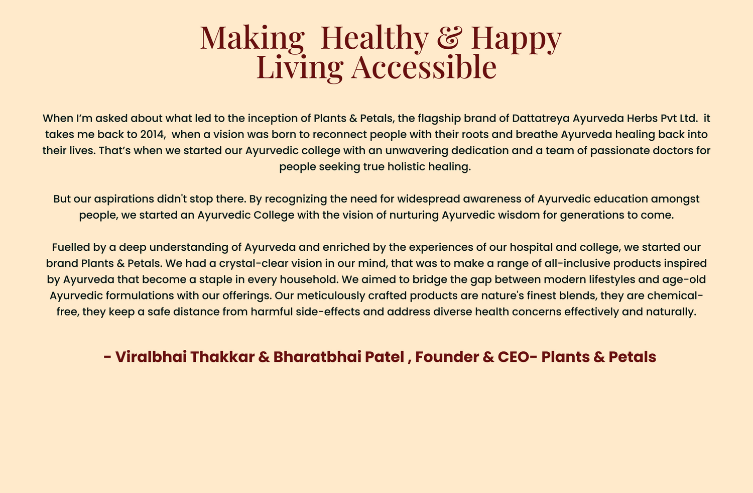 In a time where we've drifted from ancient healing practices that were unadulterated and natural, Bharatbhai Patel's commitment lies in steering us towards a healthier, happier society where true healing reconnects with nature. By sourcing our ingredients sustainably and ethically, we honour the earth and its resources, creating a harmonious cycle benefitting both people and the planet. We also believe in full transparency with what goes into making our products and the array of benefits they provide, empowering our customers with the knowledge they need to make informed choices for their well-being and reclaiming their health through the power of Ayurveda